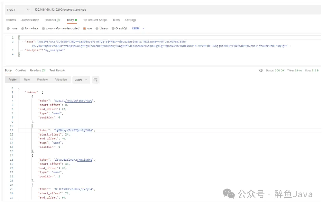 使用 Elasticsearch 自带的正则分词器对加密后的密文进行分词。检索时使用 Elasticsearch 的match进行检索。本文演示使用AES进行加解密,所以分词器我就直接使用正则匹配,将密文中的内容按照==进行拆分。