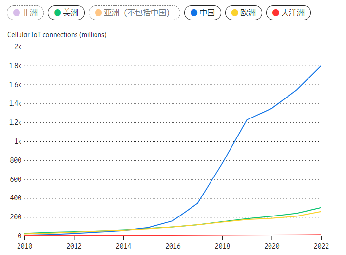 图1:按地区划分的蜂窝物联网连接数量(2010-2022年,2022年基于预测)。
