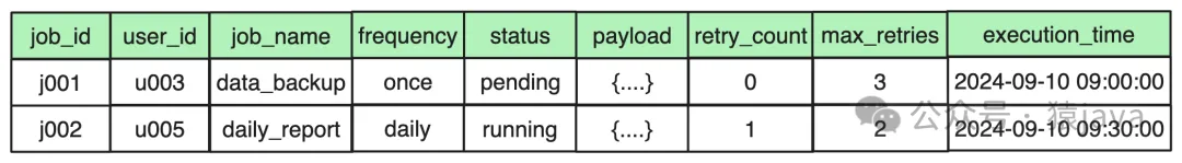 该表存储任务的元数据,包括任务ID、用户ID、频率、负载、执行时间、重试次数和状态(待处理、运行中、已完成、失败)。
