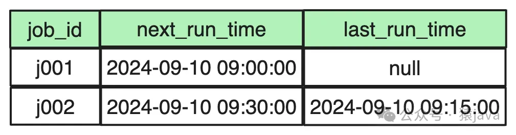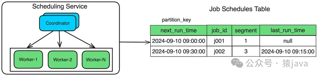 每个工作节点使用next_run_time和其分配的段查询JobSchedulesTable,以检索它负责处理的任务。