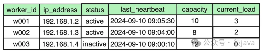 工作节点表存储每个工作节点的信息,包括其IP地址、状态、最后心跳、容量和当前负载。