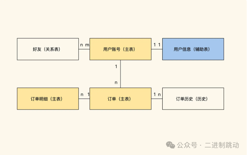 首先来看用户账号表,这是一个实体表,通常作为主表,每行数据代表一个独立的实体,并且每个实体都有一个独立且唯一的 ID 作为标识。在这里,“实体”指的是一个抽象事物,而具体字段表示该实体的实时状态属性。这个 ID 在高并发环境下的缓存中至关重要,用户登录后可以通过自己的账户 ID 快速查找对应的订单、昵称、头像和好友列表信息。如果业务主要通过这种方式查找,性能会非常好,且非常适合长期缓存。