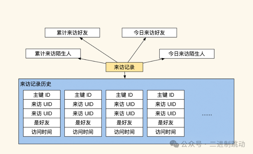 将历史记录和需要实时更新的好友状态混在一起,显然不合理。如果我们做归类梳理的话,应该拆分成三个职能表,分别进行管理:历史记录表,不做缓存,仅展示最近几条,极端情况临时缓存;好友关系(缓存关系,用于统计有几个好友);来访统计数字(临时缓存)。