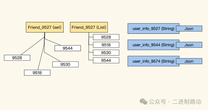 在高并发场景中,为了优化读取性能,缓存通常用于保存实体数据。常见的方法是通过“key 前缀 + 实体 ID”获取数据(例如 user_info_9527),然后利用缓存中的关联关系进一步获取指定数据。例如,通过 ID 直接获取用户好友关系的 key,从而获取用户好友 ID 列表。通过这种方式,我们可以在 Redis 中实现用户的常用关联查询操作。