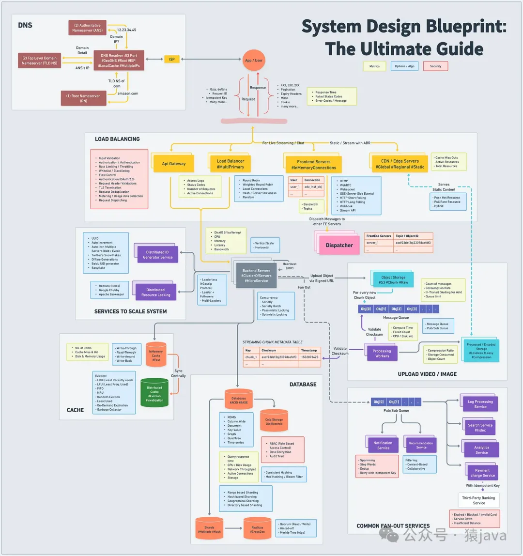 三高系统:是否是高可用,高性能,高扩展性的系统?如何保证三高?微服务:是否采用微服务,微服务的框架是什么,SpringCloud还是 Dubbo?架构:是否需要使用DDD架构?数据库:是否需要分库分表?是否需要多活设计?是否需要定时备份?负载均衡器:使用哪些负载均衡技术和算法?缓存:使用什么缓存?缓存放在哪里?如何处理缓存失效?单点故障:是否有单点问题?如何解决单点问题?身份验证/授权:如何安全地管理用户访问和权限?速率限制:如何防止过度使用或滥用 API?安全问题:如何保证系统安全和API安全?以下都是在后端组件中需要考虑的问题,当然,我们需要根据自己所处的角色和领域,灵活的设计。
