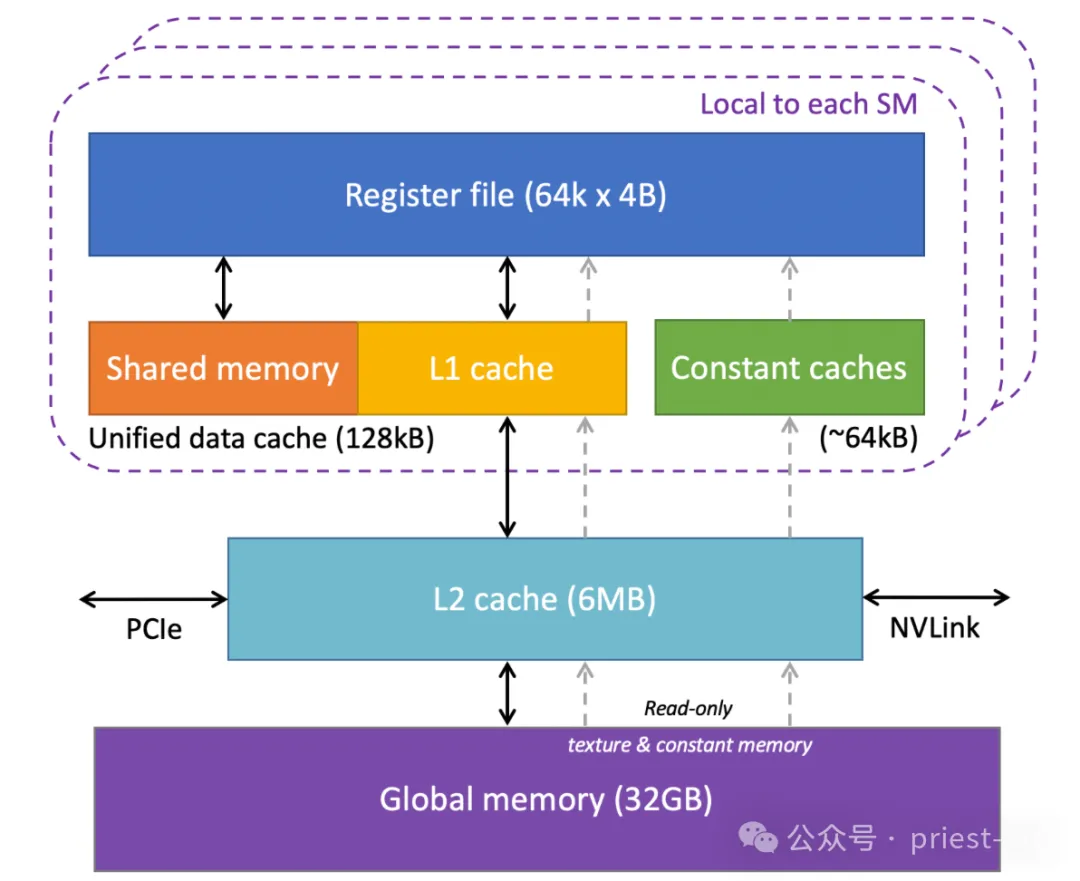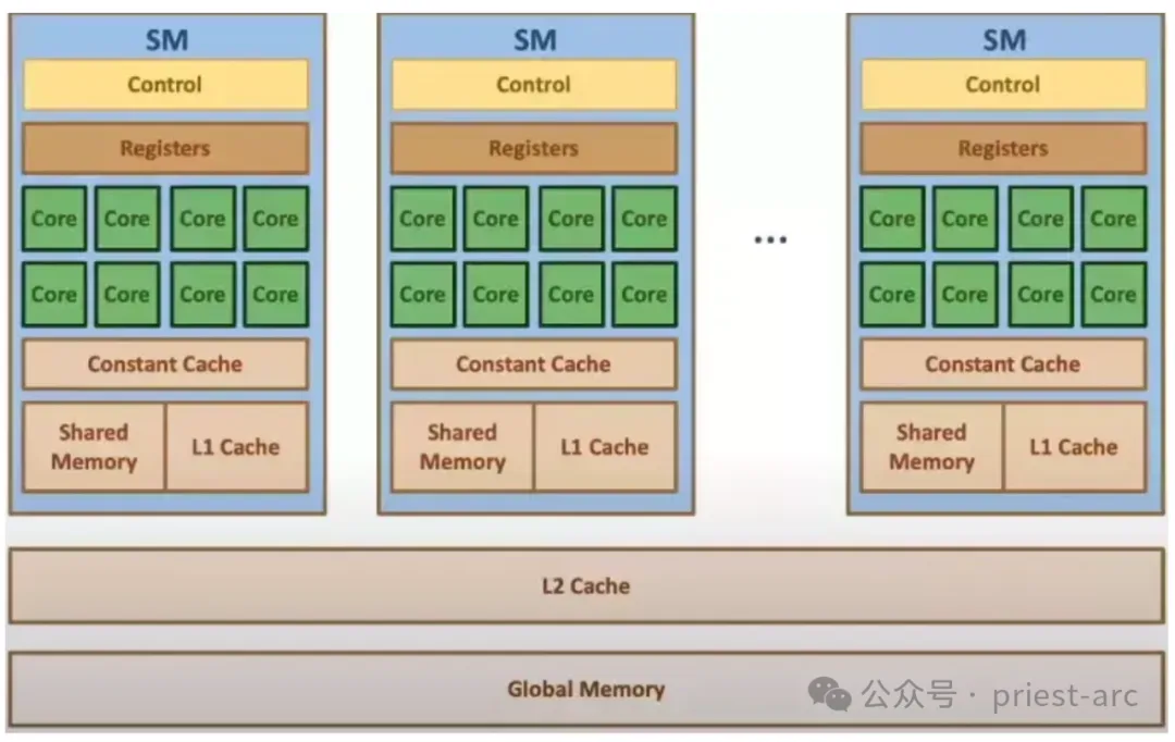 上述架构图所述与块和线程的关系非常相似,但在这里我们讨论的是流式多处理器(SM)和流式处理器(SP)。每个 SM 都拥有自己独立的共享内存、缓存、常量内存和寄存器资源,这些资源仅供该 SM 内部的线程使用。然而,所有 SM 之间共享相同的全局内存资源,所有线程都可以访问该内存。