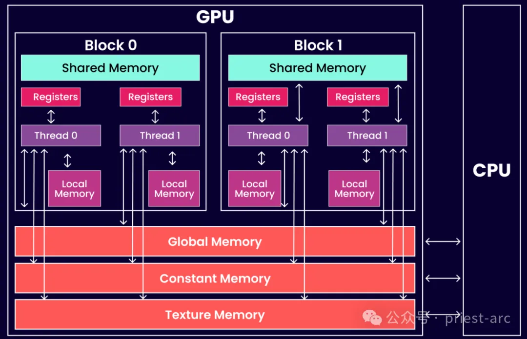 当然,我们也可以将上述内存划分为其他形式,比如,纹理内存(Texture Memory)、常量内存(Constant Memory)以及其他内存等。