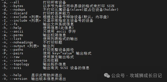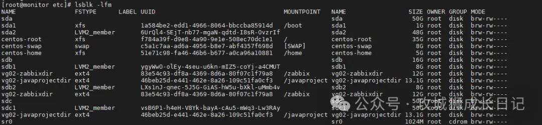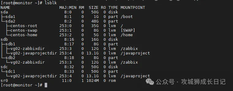 列出块设备,显示设备名称、大小、挂载点等信息。