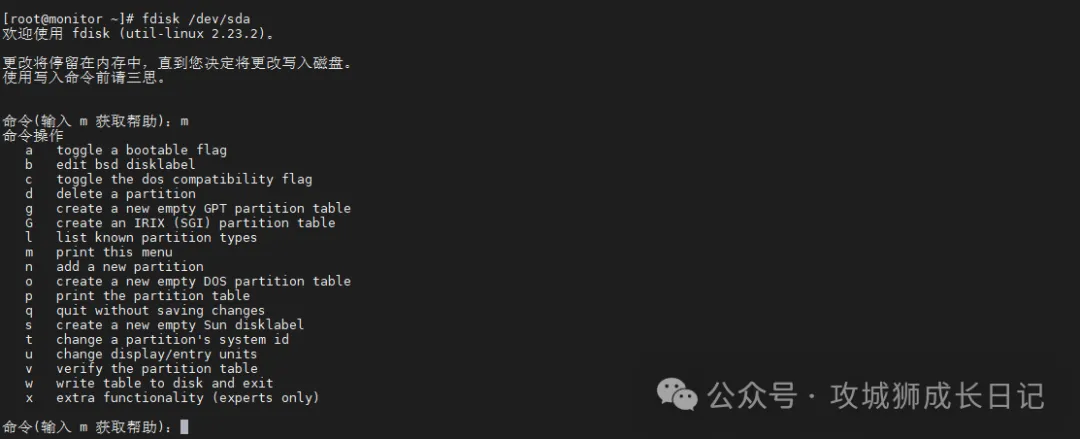 p:查看当前磁盘的分区情况。n:创建新分区。d:删除分区。w:写入更改并退出。