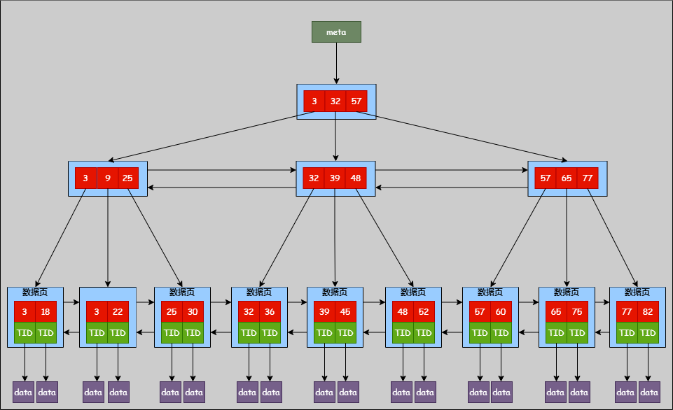 上图的索引结构中最顶层是元数据页,存储索引根节点页相关信息。内部节点位于根节点下面,只包含键值和指向子页面的指针。叶子页位于最下面一层,存储所有指向实际表数据行(TIDs)的指针。