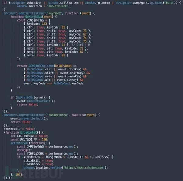 新增的JavaScript代码可检测PhantomJS、Burp Suite等浏览器自动化工具,并阻断分析相关操作。当检测到可疑行为或验证码失败(可能为安全机器人)时,系统会展示诱饵页面或跳转至乐天等合法网站。