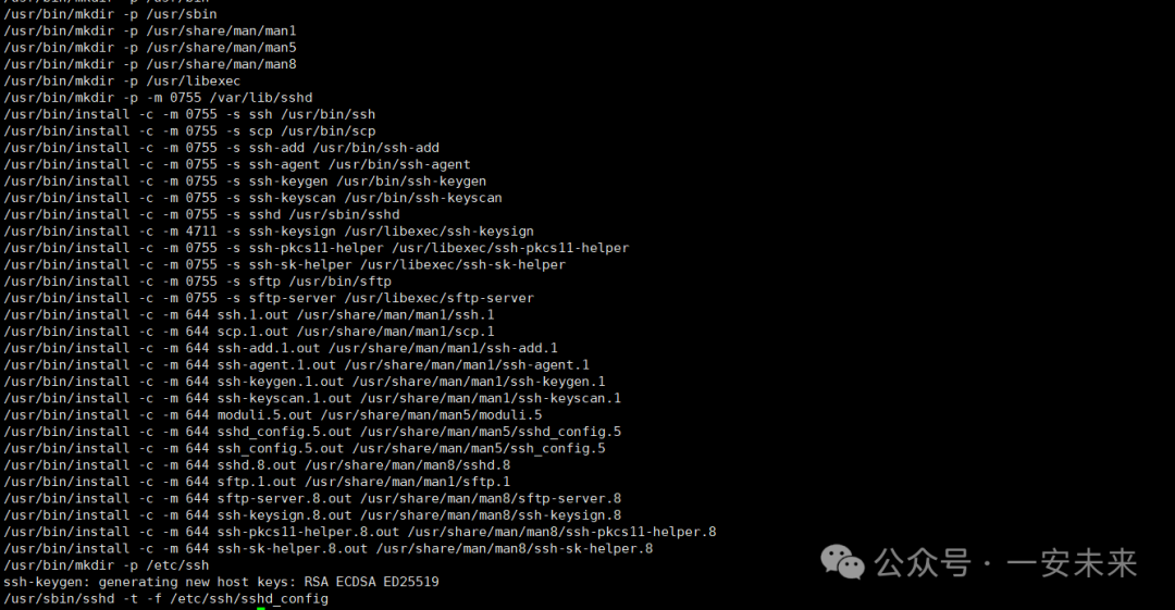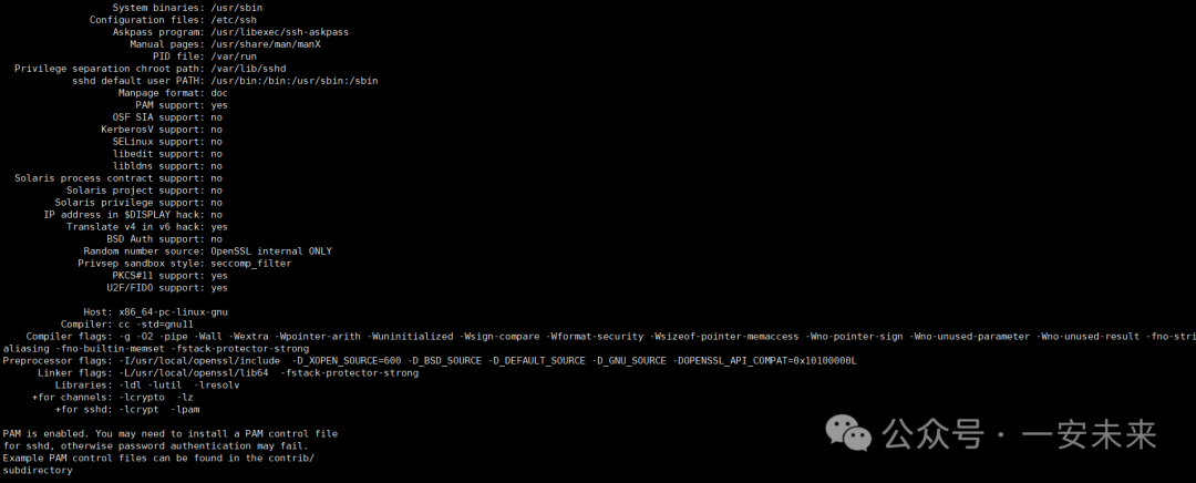 tar -zxvf openssh-9.7p1.tar.gz cd openssh-9.7p1 # 使用默认安装目录的openssl ./configure --prefix=/usr --syscnotallow=/etc/ssh --with-md5-passwords --with-pam --with-privsep-path=/var/lib/sshd --without-hardening # 使用指定安装目录的openssl(使用这个) ./configure --prefix=/usr --syscnotallow=/etc/ssh --with-md5-passwords --with-pam --with-tcp-wrappers --with-ssl-dir=/usr/local/openssl --with-privsep-path=/var/lib/sshd --without-hardening # 使用指定安装目录的openssl和zlib ./configure --prefix=/usr --syscnotallow=/etc/ssh --with-md5-passwords --with-pam --with-tcp-wrappers --with-ssl-dir=/usr/local/openssl --with-zlib=/usr/local/zlib --with-privsep-path=/var/lib/sshd --without-hardening # 编译安装 make && make install1.2.3.4.5.6.7.8.9.10.11.12.13.14.