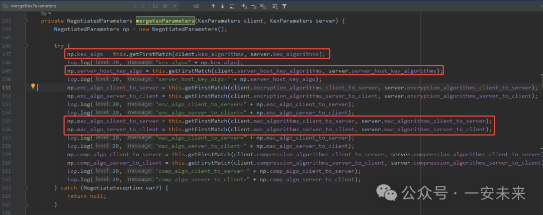 通过报错信息可知,问题出在密钥交换阶段,客户端和服务端的提议不匹配。找到ch.ethz.ssh2.transport.KexManager类,其中有个方法mergeKexParameters,这个就是匹配服务端客户端两边相关参数通用的算法,底层调用getFirstMatch去比较二者相同的算法。