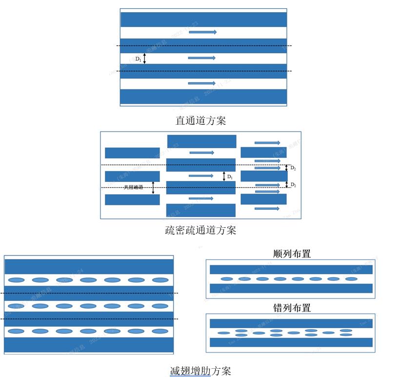 例如,为了防止系统回液端因为压强过低而出现冷却液沸腾汽化问题,解决系统流阻导致冷却液无法流动的问题,浪潮信息创新研发了低流阻冷板,相对于传统铲齿形直通道冷板,流阻更小,且又能较好地维持冷板的散热性能。与此同时,浪潮信息通过对比了多种技术路线,最终优选出疏密疏通道、减翅增肋这两种低流阻冷板设计方案。与直通道相比,采用疏密疏通道以及减翅增肋方案均可将温差控制在大约1℃以内,且均可有效降低冷板的流阻。