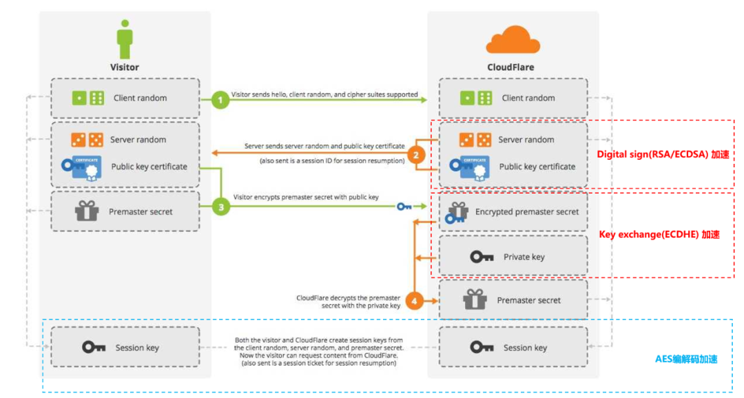 硬件加速核心是将TLS中的非对称加解密操作剥离出来,放到硬件加速卡里计算,即解放了CPU,同时专用的硬件加速卡也提供了更高的加解密性能,这是典型的硬件OffLoad技术方案。