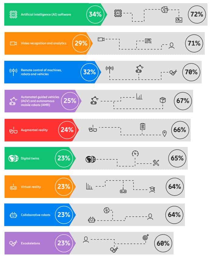 2021年爱立信工业实验室报告预测,未来10年,制造业企业将实现80%的自动化。据说将看到更多使用的工具包括人工智能软件、视频识别、增强和虚拟现实、协作机器人、视频识别、数字孪生、自动导引车(AGV)和外骨骼。