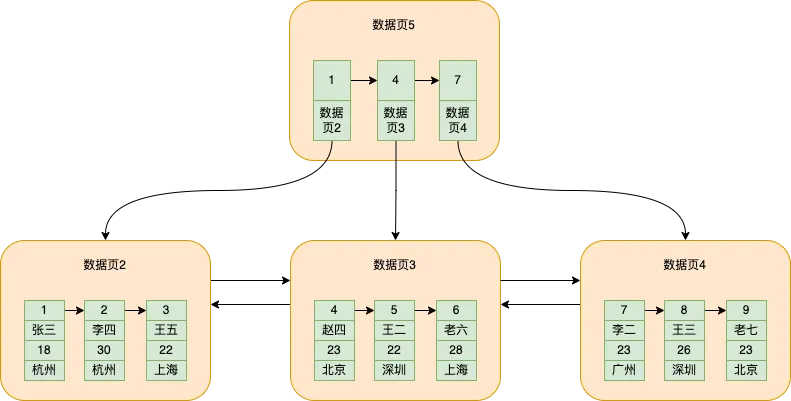 现在,如果有多个数据页,当我们需要查找id=5的数据,怎么办呢?
