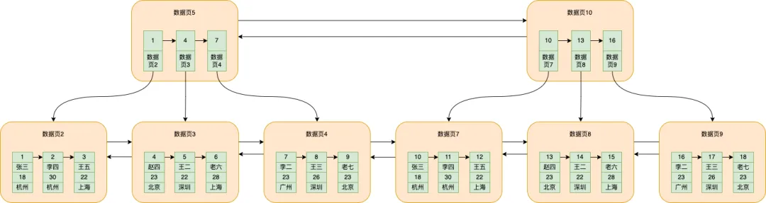 从数据页11根据二分查找定位到id=5对应数据页5再到数据页5根据id=5二分查找定位到数据页3再到数据页3根据id=5查找数据,具体的逻辑前面也提到很多次了这样就能成功查找到数据了。
