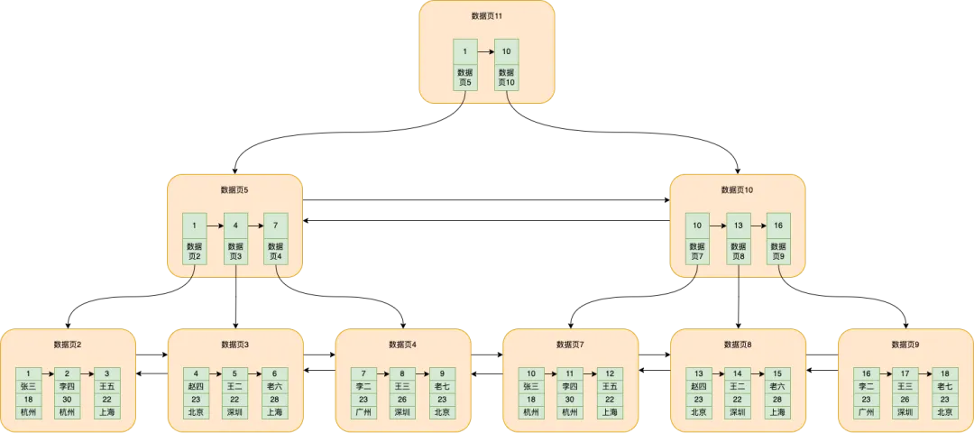 数据页11就是新抽取的数据页,存储了id=1和对应的数据页5的页号以及数id=10和对应的数据页10的页号。