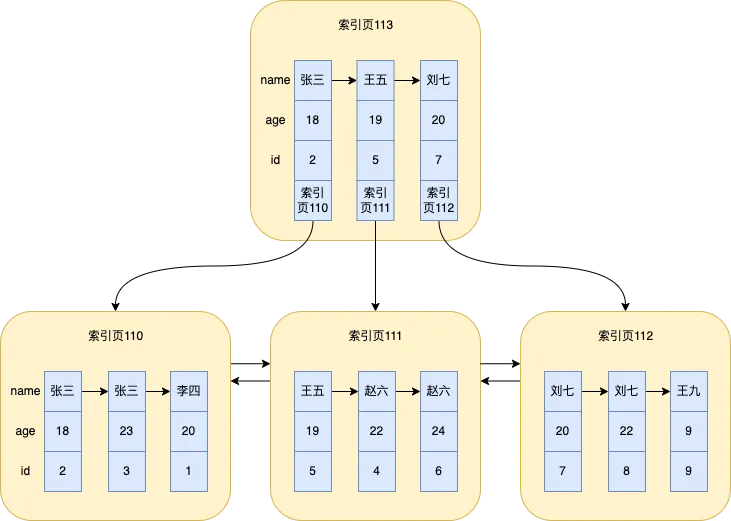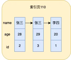 比如,在name和age上建立一个联合索引,此时单个索引页就如图所示