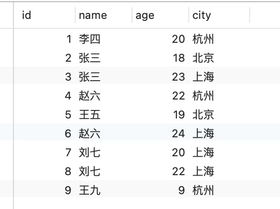 先以name排序,name相同时再以age排序,如果再有其它列,依次类推,最后再以id排序。