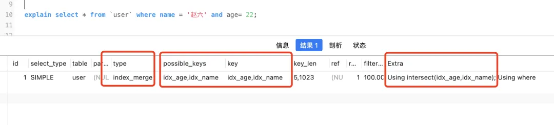 type是index_merge,并且possible_key和key都是idx_name和idx_age,说明使用了索引合并,并且Extra有Using intersect(idx_age,idx_name),intersect就是交集的意思。