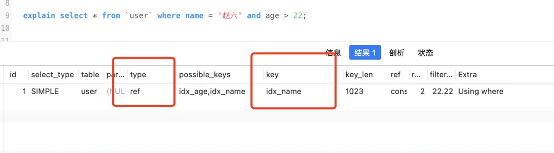 于是22会被隐式转成数字,之后再跟age比较,此时age字段并没有发生隐式转换,所以不会失效。