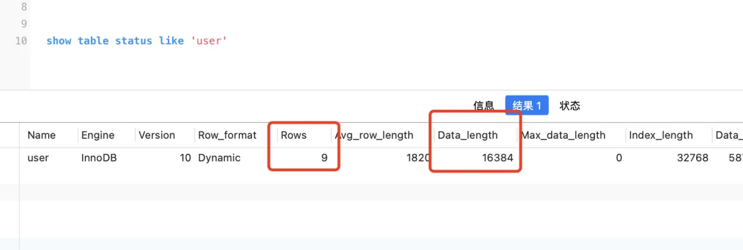 比如这个表大致有多少条数据rows,以及聚簇索引所占的字节数data_length,由于默认是16kb,所以就可以计算出(data_length/1024/16)大概有多少个数据页。