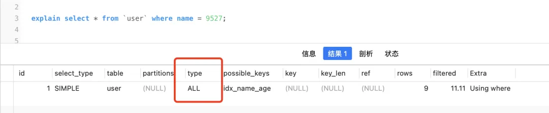 ALL说明没走索引,失效了。
