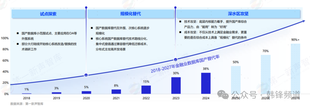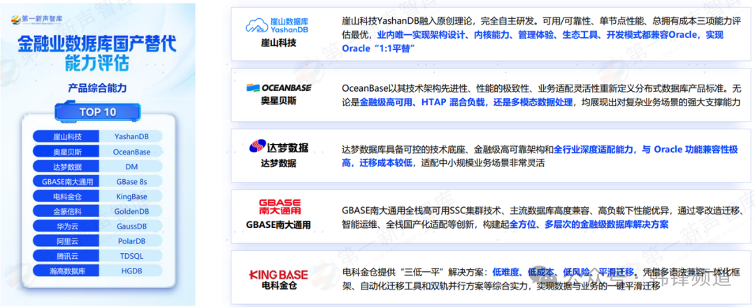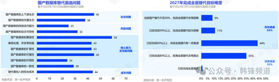 近日,由第一新声发布《2025年中国金融业数据库 国产替代能力评估报告 》。此份报告由第一新声智库连续多年追踪研究,并于今年启动问卷征集、专家访谈等专项调研工作,累计回收300余份有效问卷,其中金融业专项问卷103份,并结合大量专家的定性研究内容,最终完成此份报告。报告可以真实反映出金融业数据库当前替换进程、核心问题、主流厂商及能力对比等,报告结尾部分的 TOP10 厂商,可以供金融从业者更好地选择。本人也参与到此份报告的编写中,贡献微薄力量。下文,就是针对报告内容的一点个人解读。