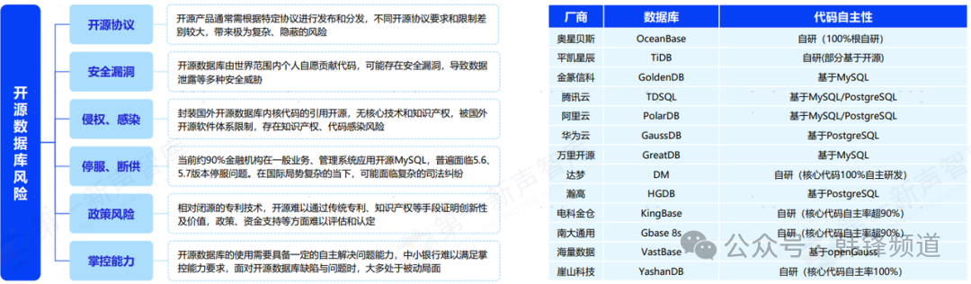 作为数据库替换的核心,是在于对底层技术栈的“自主可控”。这是做替换的作为核心的诉求,然而一个不可回避的问题是开源与自主可控问题。众所周知,国产数据库绝大多数都是基于开源(或少部分购买商业)的方式构建而成,真正完全自研的少之又少。上述方式虽然加速了产品的成熟度及商业化进程,但也不避免带来多重风险隐患。金融业作为涉及国计民生的关键行业,对安全性尤为关注。基于开源构建,并不代表不具备自主可控能力,关键在于其消化吸收能力。一方面各厂商提供如核心代码自主率的证明,一方面诸如国测考试对厂商进行真刀真枪的考核;但无论是那种方式还都无法真正反映厂商自主能力,更多的还是要从核心技术解读、复杂问题分析、故障排查与修复、产品规划与演进等多个角度来综合判断。