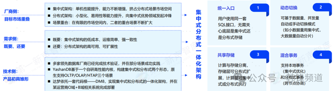 集中式与分布式,是数据库常见的两种技术架构,那么一体化融合架构正是着眼于将这两种架构有机整合。其优势在于实现了技术特性的最佳融合与业务场景的全面覆盖,通过统一引擎同时提供集中式部署的高性能(单机TPC-C达百万级tpmC)与强一致性(ACID事务保障),以及分布式部署的弹性扩展(支持千节点集群)与高可用性(RTO<30秒),使金融机构能够根据业务特征灵活选择部署模式——如核心交易系统采用集中式确保低延迟,互联网业务选用分布式实现水平扩展。这种架构有效解决了传统技术路线"二选一"的局限,既降低了混合架构的运维复杂度(管理成本降低40%),又规避了不同数据库间的数据同步难题(消除ETL延迟),成为支撑金融业从传统核心系统到新型互联网业务的全场景数据库解决方案。