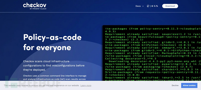 2. CheckovCheckov是一款开源基础设施即代码(IaC)扫描器,可检测安全和合规性错误配置。它支持Terraform、CloudFormation和Kubernetes等多种IaC框架,帮助团队在开发周期早期识别风险。