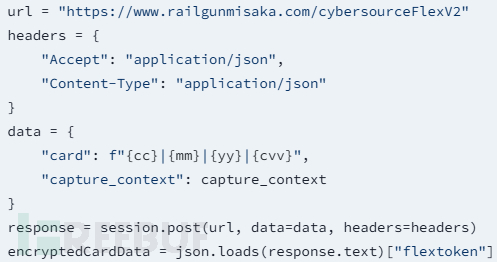 该恶意包包含的Python脚本会访问正规WooCommerce网站,收集商品ID并通过调用商店后端将商品加入购物车。随后,脚本会跳转到结账页面,窃取CSRF令牌和捕获上下文(capture context)——这是CyberSource用于安全处理信用卡数据的代码片段。