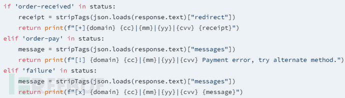 最后,脚本会提交包含令牌化信用卡的订单。若交易通过,则证明该卡有效;若失败则记录错误并尝试下一张卡。通过这种方式,攻击者能够自动化验证大量被盗信用卡。这些已验证的信用卡随后可被用于金融欺诈或在网络犯罪市场出售。