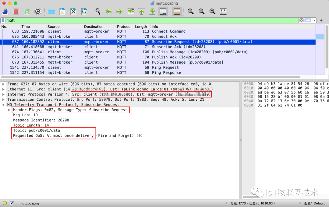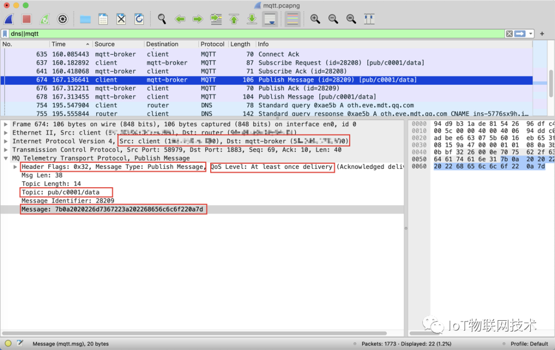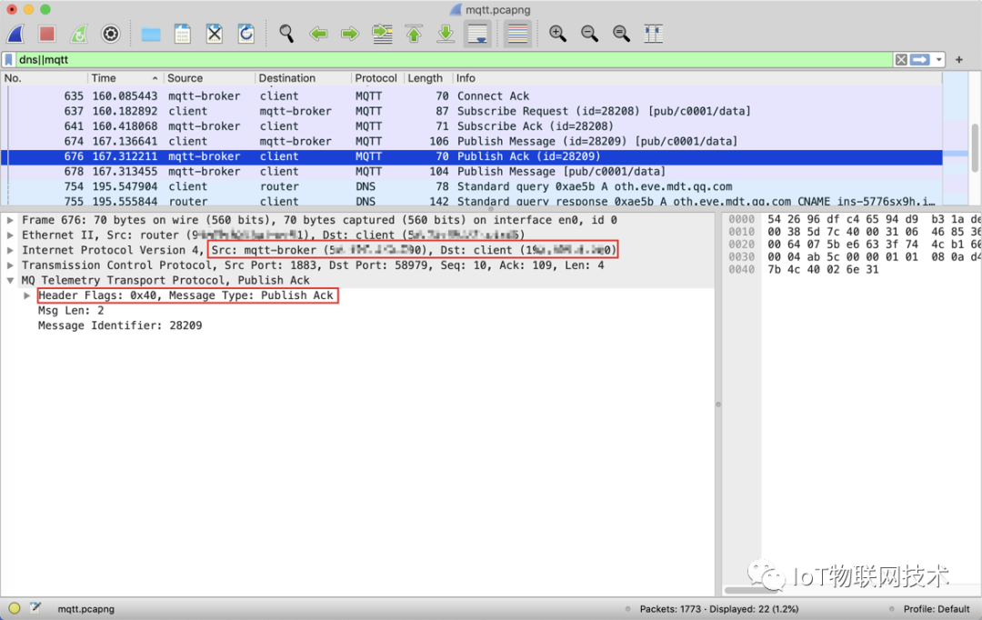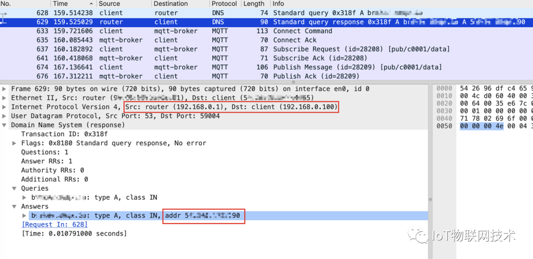 观察DNS网络包,你会发现终端设备先去请求了 MQTT-Broker 服务器域名对应的 IP 地址。在 DNS 的 Answer 中终端设备获得了 addr 值,用于接下来的TCP/IP 网络连接。