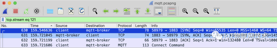 2.TCP 三次握手终端设备建立 MQTT 长连之前,需要先建立 TCP连接,即终端设备与MQTT-Broker 服务器的三次握手。