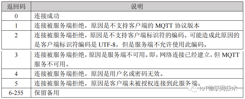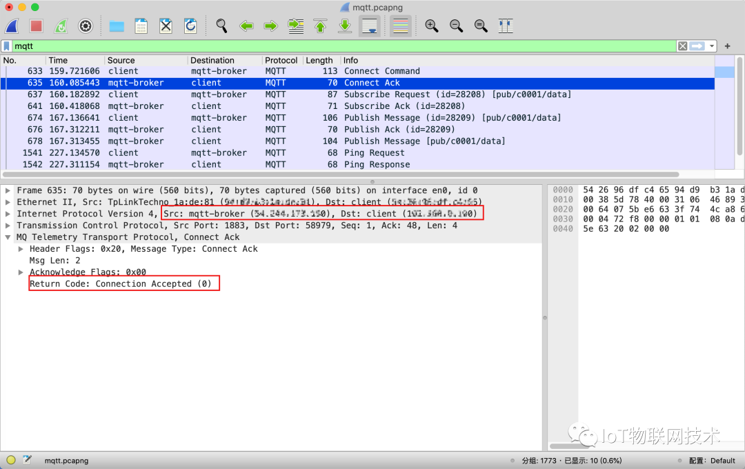 MQTT-Broker 服务器收到终端设备建立连接请求,身份验证通过后,应答CONNACK报文,其中 ReturnCode 为0,如下图。