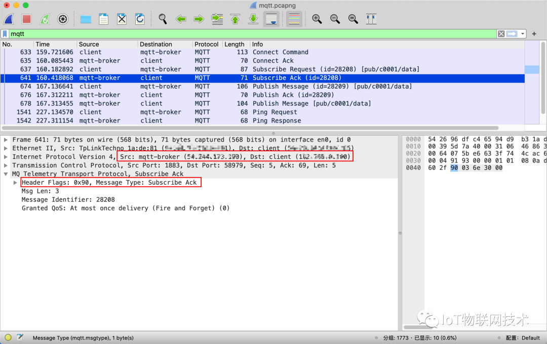 MQTT-Broker 服务端成功建立订阅关系后,会给终端设备响应SUBACK,如下图。