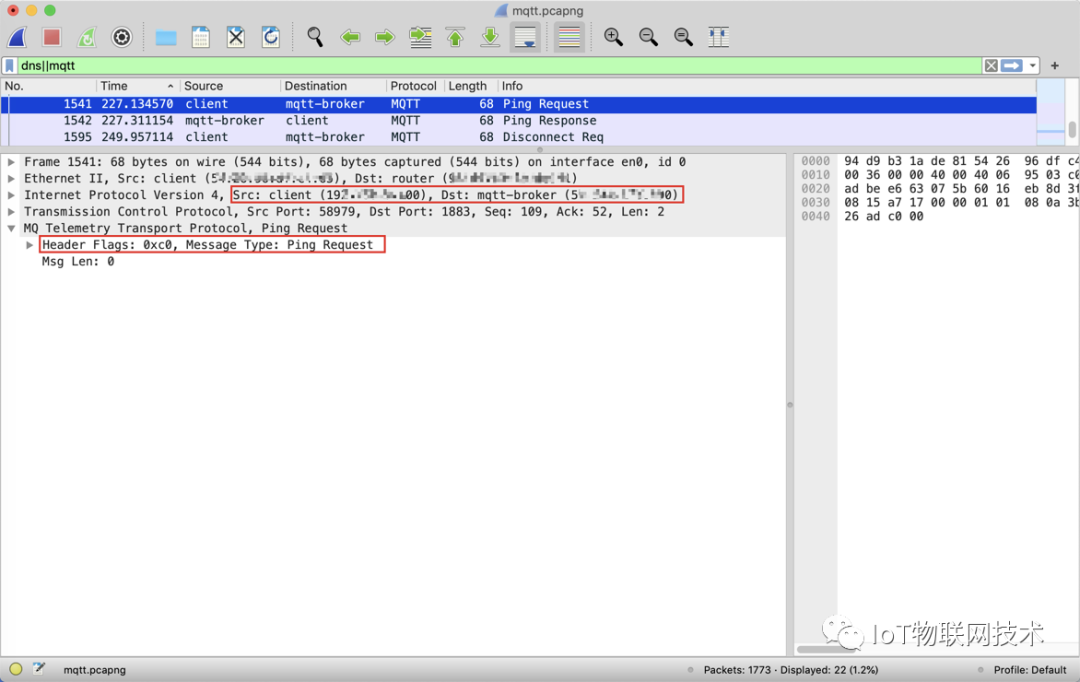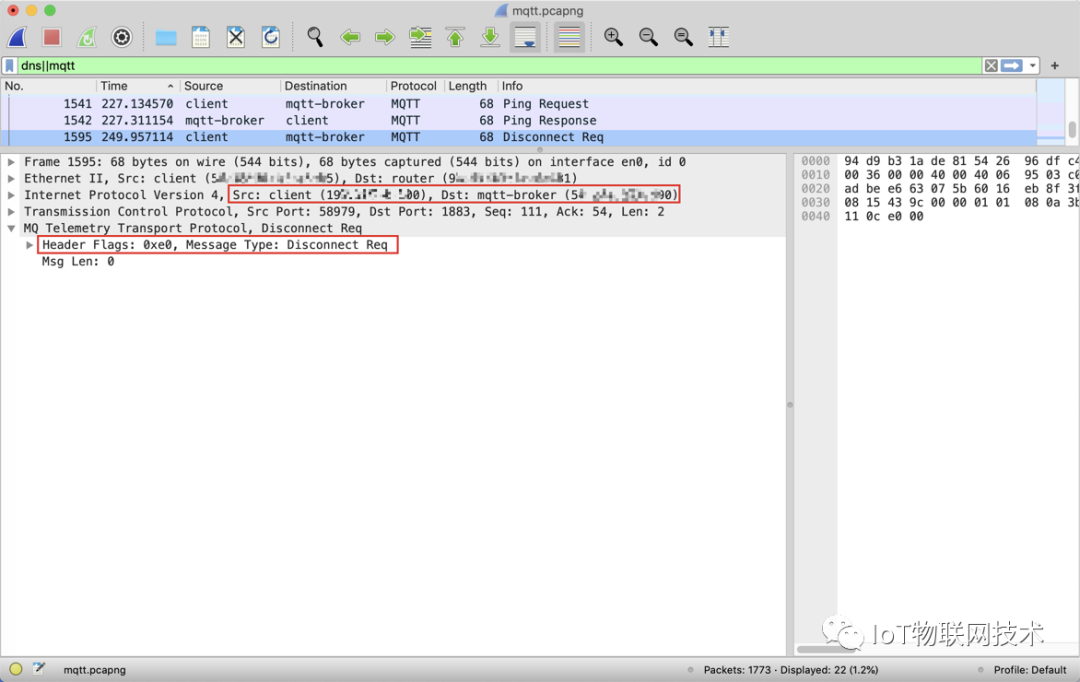 你会发现终端设备先做了DNS解析,再建立 MQTT 长连接通道,订阅业务主题,上报采集的数据,通过发送心跳包实现连接保活,业务处理完后主动断开长连接。