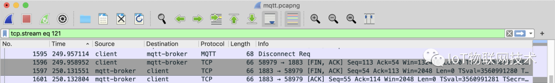 当终端设备需要断开 MQTT 长连接时,可以MQTT-Broker 服务器主动发送DISCONNECT 报文,如下图。