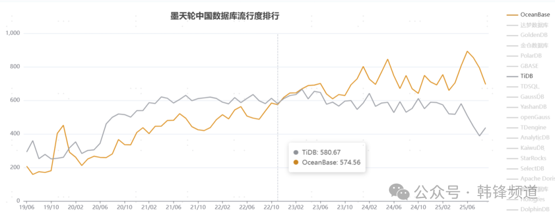 作为国内作为流行的开源数据库,OceanBase与TiDB长期受到市场关注,也是墨天轮数据库流行度排行榜头部的常客。但从排行榜来看,OceanBase与TiDB呈现出明显不同的发展轨迹,两者之间存在一个关键的战略拐点。前期阶段(2019-2021年),TiDB凭借其开源策略和技术创新优势,早期流行度明显高于OceanBase。作为国内首个分布式NewSQL数据库,TiDB通过开源社区建设迅速积累了开发者认可,在互联网和企业市场获得了广泛关注。关键拐点(2022年左右),这一时期OceanBase实现了历史性反超,并逐渐拉开与TiDB的差距。这一拐点的本质源于两者截然不同的市场策略:OceanBase采取了深耕核心行业+生态共建的深度策略,而TiDB则延续了开源社区+技术驱动的广度策略。
