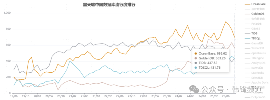OceanBase作为市场领跑者,展现出后来居上的强劲势头。其流行度指数达到695.62,长期稳居榜首且保持上升趋势。这一表现源于其独特的商业化路径:早期深耕阿里内部场景,随后重点突破金融核心系统,通过支付宝等标杆案例建立口碑,再逐步向政务、运营商等行业扩展。OceanBase的成功证明了自研内核+金融级可靠性+开源生态三位一体策略的有效性。