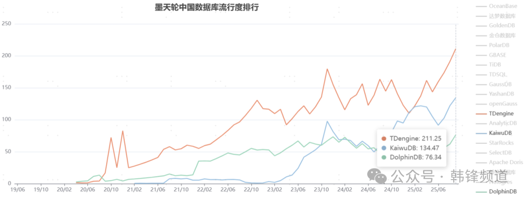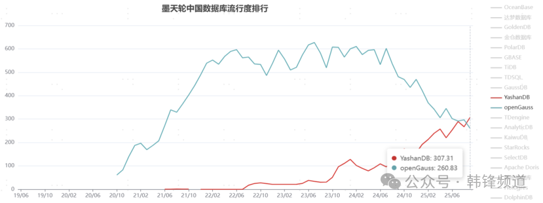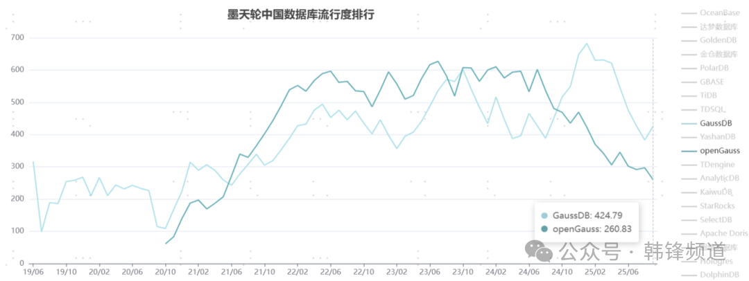 相比之下,开源产品openGauss则经历了先扬后抑的发展波折。早期凭借开源理念和技术先进性获得关注,流行度一度快速上升,但随后逐步下滑至260.83,跌出前十行列。这一轨迹深刻反映了开源模式在中国市场面临的挑战:企业用户更看重全栈服务和技术支持而非单纯代码开放;开源社区建设需要长期投入但商业回报缓慢;在关键行业场景中,企业往往更倾向于选择有商业保障的产品。