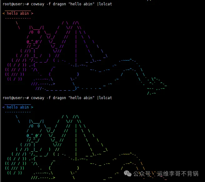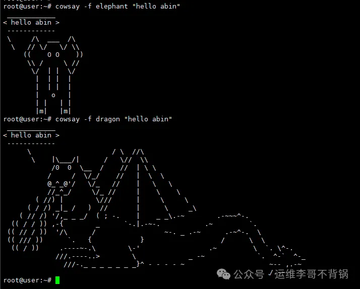 cowsay "hello abin" # 可以查看他支持哪些动物 root@user:~# cowsay -l Cow files in /usr/share/cowsay/cows: apt bud-frogs bunny calvin cheese cock cower daemon default dragon dragon-and-cow duck elephant elephant-in-snake eyes flaming-sheep fox ghostbusters gnu hellokitty kangaroo kiss koala kosh luke-koala mech-and-cow milk moofasa moose pony pony-smaller ren sheep skeleton snowman stegosaurus stimpy suse three-eyes turkey turtle tux unipony unipony-smaller vader vader-koala www # 显示大象 cowsay -f elephant "hello abin" # 显示龙 cowsay -f dragon "hello abin" # 可以加个颜色,帮你打印出来一个有颜色的动物图案 cowsay -f dragon "hello abin" |lolcat1.2.3.4.5.6.7.8.9.10.11.12.13.14.15.16.17.18.19.20.