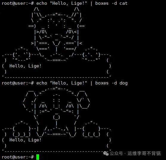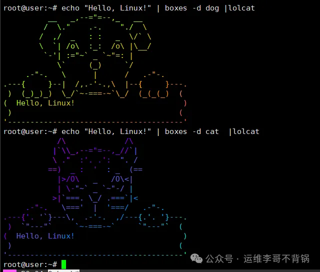 # 显示猫 echo "Hello, Lige!" | boxes -d cat # 显示狗 # 添加颜色,结合lolcat使用 echo "Hello, Linux!" | boxes -d dog |lolcat echo "Hello, Linux!" | boxes -d cat |lolcat1.2.3.4.5.6.7.8.9.