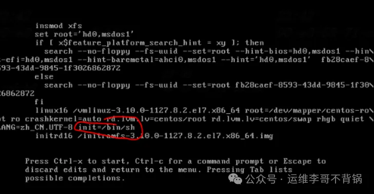 在后面输入: init=/bin/sh,并按 ctrl x 执行: