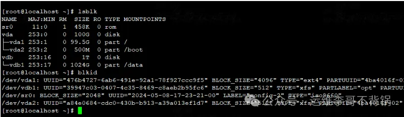 lsblk:列出系统中所有块设备(磁盘、分区等),非常适合快速查看磁盘挂载情况。blkid:查看每个设备的 UUID 和文件系统类型,适用于 fstab 静态挂载。复制