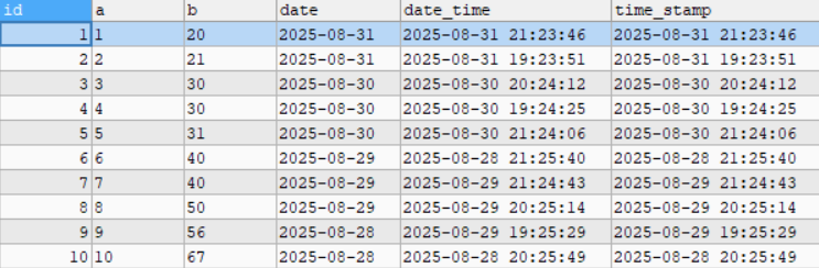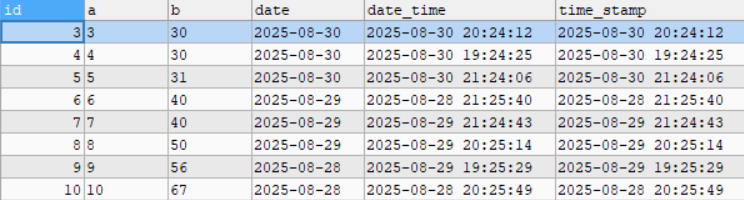 SELECT * FROM test3 WHERE date_time BETWEEN 2025-08-28 00:00:00 AND 2025-08-31 00:00:00;1.