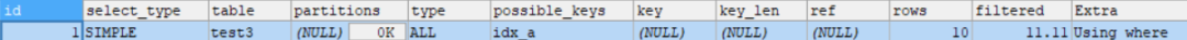 虽然字段 a 上面有普通索引,但是查询的是表 test3 中的所有字段,也是走不上 a 这个索引的。我们看一下执行计划: